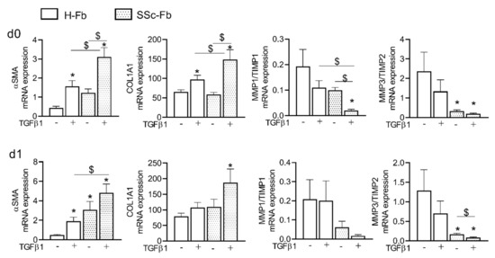 Comparison of the phenotype of healthy and SSc fibroblasts in standard culture conditions or after TGFβ1 stimulation. Fold change of gene expression (n = 12). *: p < 0.05 compared to H-Fb (−TGFβ1); $: p < 0.05 compared to the indicated group.