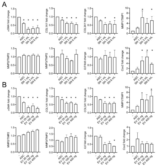 Effects of ASC-EVs on TGFβ1-stimulated fibroblasts. (A) Fold change of gene expression in TGFβ1-stimulated fibroblasts using different volumes of conditioned supernatants (SN) from healthy ASCs (n = 4). (B) Fold change of gene expression as in (A) (n = 18). *: p < 0.05.