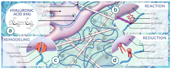 Properties of HA in the context of the ECM of fascia. Matrix organization of HA varies by tissue type reinforced mechanically by types of collagen fibers and managed by tissue-specific cell types. (a) HA consists of repeating disaccharide units of D-glucuronic acid and N-acetyl-D-glucosamine structured as a single polysaccharide chain abundantly present in the extracellular matrix (ECM). (b) Extracellular HA plays a role in adhesivity via cell receptors. Mechanical properties of HA are dictated by molecular weight, abundance and fluid dynamics. The cluster determinant 44 (CD44) embedded in the cell membrane mediates adhesion, migration and intracellular signaling. The receptor for HA-mediated motility (RHAMM) modifies intracellular signaling. (c) HA concentration is coordinated by hyaluronan synthases which is (d) balanced by snipping enzymes referred to as hyaluronidases. Based on [17,18,19].