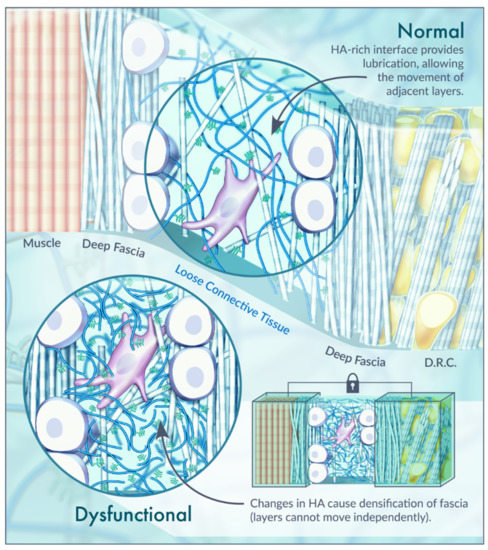In conclusion, an important component of pain therapy is to reverse these changes in HA. When the HA becomes adhesive rather than lubricating, the distribution of lines of force within the fascia become distorted. This is referred to as the densification of fascia [67]. Thickening and densification of the loose connective tissue and its ECM correspond to the reduction in or loss of fascial sliding ability [68]. If loose connective tissue is lost or its density is altered, the behavior of the fascia and underlying muscle becomes compromised (Figure 3) [41]. One key ingredient affecting fascia density appears to be the status of HA [24]. Diet, exercise, or overuse syndromes that result in negative modifications to the loose connective tissue can lead to this distortion of the loose connective tissue between the layers of deep fascia, causing fascial densification. Due to the properties of HA within the ECM, it is theorized that this alteration is reversible through modifications of temperature, pH and mechanical strain (such as massage) [24,67]. A. Stecco et al. (2013) also suggest modifications to viscosity, including a reversal of the aggregation of the HA fragments using increased temperature and local alkalization. The authors hypothesized that these alterations can be accomplished with massage, manipulation, or physical therapies causing disaggregation of the pathologic chain–chain interactions through increases in the subcutis temperature [6]. Validity is therefore provided for massage and other forms of body work that often provide relief for myofascial pain.