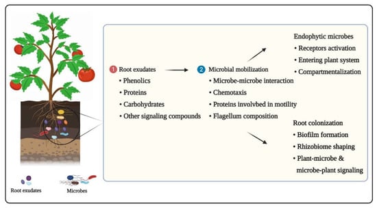 Various steps that occur during the assembly of the plant microbiome are depicted schematically. Firstly, plants release signaling molecules (i.e., phenolics, proteins, etc.) in the form of rhizodeposits to attract microbial community (step 1). Secondly, microbes respond to plant oriented signaling molecules by initiating mobilization and colonizing various plant parts as epiphytes and endophytes (step 2). The final diversity of the plant microbiome is shaped by a series of stages involving intricate signaling between plants and microorganisms.