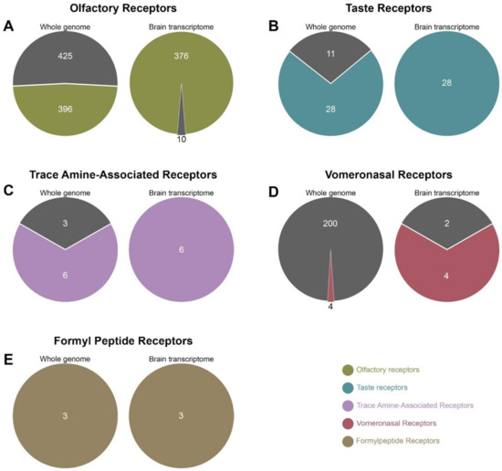 Genome versus transcriptome comparison of human chemoreceptors (CRs). The number of genes and pseudogenes expressed in the whole genome (left pie charts) was compared to those found to be transcribed (right pie charts), for all CR families: olfactory receptors (A, green), taste receptors (B, blue), trace amine-associated receptors (C, purple), vomeronasal receptors (D, red) and formyl peptide receptors (E, brown), The coloured areas correspond to coding genes and dark grey areas to pseudogenes. The census of genes expressed in the brain transcriptome was carried out using data from all five subjects available in the Allen brain atlas.