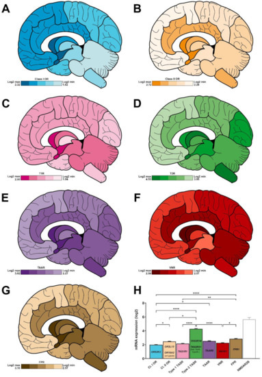 Trace amine and pheromonal cues are deciphered by three CR families—TAARs, VNRs, and FPRs—that are all present in the human brain, with an average log2 expression of 2.52 ± 0.06, 2.26 ± 0.04, and 2.85 ± 0.05, respectively. Their cerebral area-related distribution is as follows.