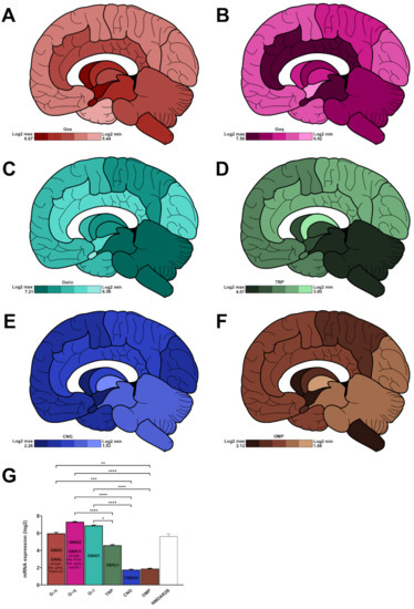 Regionalised mean expression of chemoreceptor-associated partners in a human brain collected from a 31-year-old Caucasian subject. (A–F), log2 expression for Gαs (A, red), Gαq (B, pink), Gαi/o (C, light blue), transient receptor potential channels (D, green), cyclic nucleotide-gated channels (E, dark blue), and olfactory marker protein (F, brown). The maximum and minimum expression levels are indicated in the bottom left panel for each family. (G) mean expression for each family in the whole brain (n = 13 main areas). The most expressed members for each family is indicated inside each bar. NMDAR2B gene expression (empty bar, grey, was added as a positive control). *: p < 0.05, **: p < 0.01, ***: p < 0.001, ****: p < 0.0001 (Kruskal–Wallis test followed by Dunn’s multiple comparisons post hoc test). For clarity purposes, NMDAR2B was excluded from the statistical analysis.