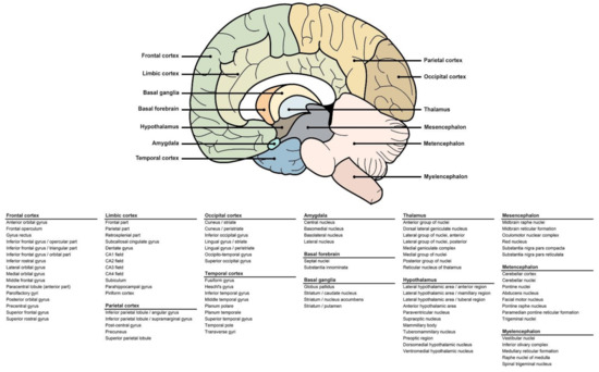 Areas of the human brain included in the study. Visual representation of the human brain with arrows indicating the main areas (top). Table detailing the substructures included in each main zone (bottom).
