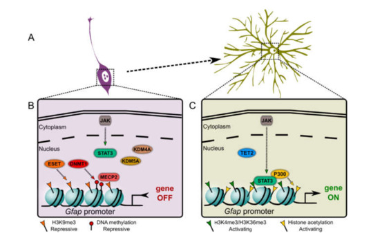 In the context of astrocyte differentiation, it has been recognized that following STAT3 activation, this transcription factor bound the Gfap promoter and activated Gfap expression. However, accessibility of STAT3 and binding to the Gfap promoter were abolished if the respective genomic regions contained high levels of DNA methylation [78]. S100B is a calcium binding protein and its expression is widely used to describe astrocytes [1,79,80]. Unlike GFAP, S100B is also expressed by immature astrocytes [81]. The gene encoding for S100B is also subjected to regulation by DNA methylation, as it contains methylated sites at the promoter region that are demethylated when NPCs start to differentiate towards astrocytes. Following demethylation, the repressor MECP2 was released from S100b gene promoter and allowed activation of transcription [82].