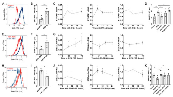 IFN-γ, 0.5%FBS and PDGF-BB modulate sialylations and expression of sialyltransferases. MSCs were cultured for 2 days with either IFN-γ (50 ng/mL), with low fetal bovine serum (0.5% FBS) or PDGF-BB (10 ng/mL) and stained using the lectin SNA, coupled to FITC. (A,E,H) show representative histogram plots, while (B,F,I) show quantification of the mean fluorescent intensities, with each dot representing a biological replicate (i.e., MSCs derived from a different donor). (C,G,J) show mRNA levels of ST6Gal1, ST3Gal1 and ST3Gal4, relative to GAPDH x 1000 (n = 4–5). Differences are calculated in comparison to time 0. (D,K) show mean fluorescent intensity of cells treated with either IFN-γ or PDGF-BB and specific inhibitors. MFI: Mean Fluorescence Intensity. a.u.: arbitrary units. * p < 0.05; ** p < 0.005; *** p < 0.0005; and **** p < 0.00005 as calculated using t-test or 1-way ANOVA.