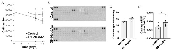 To explore how a reduction in sialylation could promote cell survival, an apoptosis protein array was performed with cells after 6 days under ischemic culture conditions, which is the earliest time point where we noticed a trend toward higher survival in MSCs pretreated with 3F-Neu5Ac. Among the 35 proteins detected, only catalase was consistently increased in MSCs derived from two donors (Figure 4B,C). Catalase catalyzes the conversion of hydrogen peroxide (H2O2) into water (H2O) and molecular oxygen (O2) and is, therefore, a key enzyme in the reduction of reactive oxygen species (ROS) [31]. The increase in catalase expression was further confirmed at mRNA level (Figure 4D), also tested in cells after 6 days in ischemia. However, the differences were rather modest at this time point, making it uncertain if this would impact overall oxidative stress within the cells. In summary, pre-treating MSCs with 3F-Neu5Ac promotes cell survival in vitro, which might be associated with increased expression of catalase, possibly reducing oxidative stress in the cells.