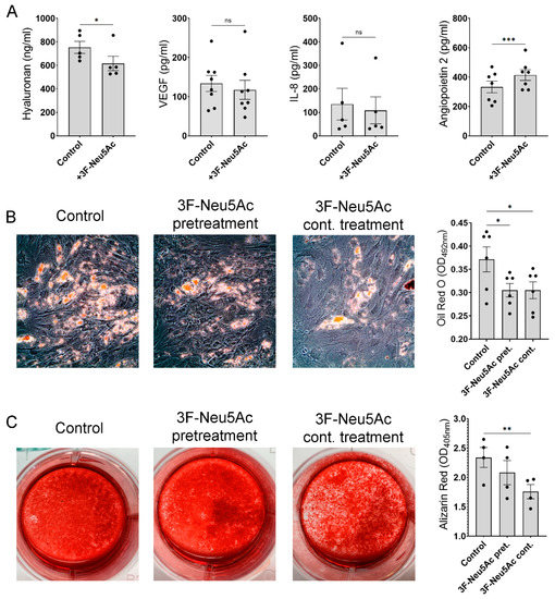 To also assess if 3F-Neu5Ac would affect the osteogenic and adipogenic differentiation of MSCs, we used two approaches. First, cells were only pre-treated with the inhibitor, 2 days prior to the start of differentiation. Second, MSCs were continuously treated with the inhibitor (including the 2 days pre-treatment and addition of 3F-Neu5Ac with every medium change during differentiation). Adipogenesis was measured by Oil-red O staining, which binds to the triglycerides contained in adipocytes, while osteogenesis was measured by quantification of Alizarin Red S (ARS) staining, which binds to mineralized calcium. As shown in Figure 5B,C, both pre-treatment and continuous treatment with 3F-Neu5Ac caused a significant reduction of adipogenic differentiation of the cells. In contrast, osteogenesis was only significantly reduced after continuous treatment with 3F-Neu5Ac.