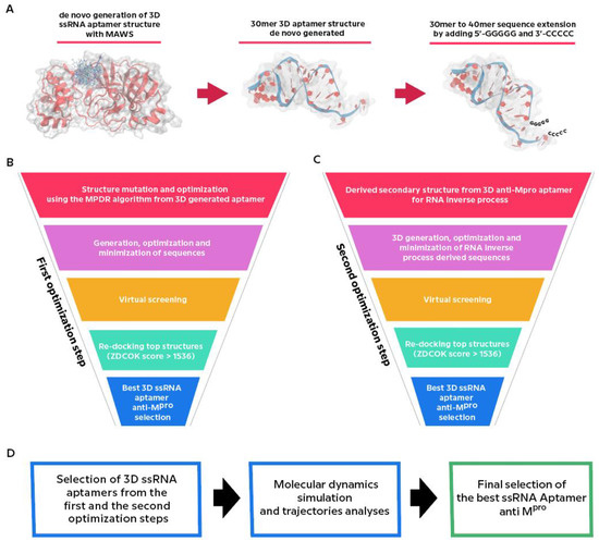 Schematic of the workflow for the anti-Mpro ssRNA aptamers. (A) initial 30mer 3D ssRNA aptamer generation. (B) First optimization step. (C) Second optimization step. (D) Schematic of Molecular Dynamics simulation and trajectories analyses and best aptamer selection. See details in the text.