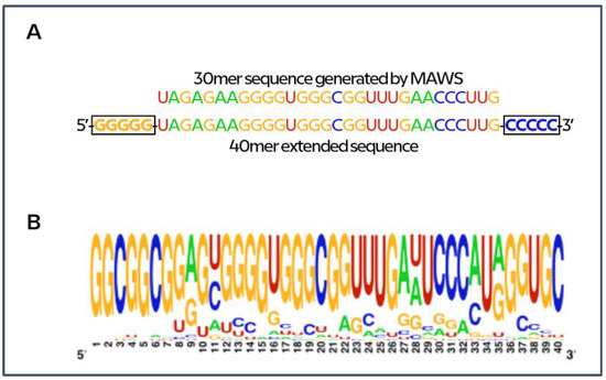 (A) Originated 30mer MAWS sequence extended to 40mer before elitist genetic algorithm mutation process (MPDR). (B) Weblogo image that shows residue frequencies of generated (40mer) sequences from 30mer starting sequence (https://weblogo.berkeley.edu/logo.cgi, February 2021).
