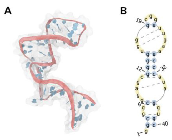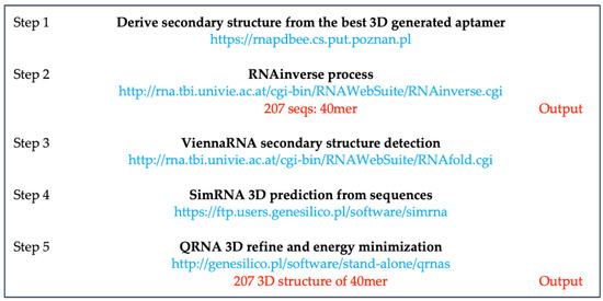 Starting from the best de novo 40mer 3D aptamer, we also derive the secondary structure through RNAPDBEE [68,69] and submit then to the RNAinverse process by using the ViennaRNA web server [70,71] for finding a sequence that adopts a given secondary structure. The RNAinverse algorithm starts with a selected nucleotide sequence and keeps changing nucleotides until the RNA sequence adopts the desired fold. A total of 207 sequences were generated and the 3D structure was further modeled using ViennaRNA for secondary structure detection [44], SimRNA 3D [72] for structure prediction from the sequence, and QRNA 3D [73] for refinement and energy minimization (Figure 12).