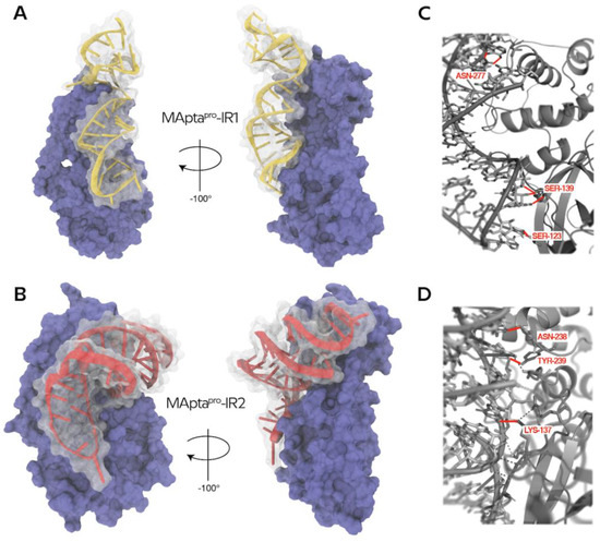 The aptamers were called MAptapro-IR1 (GGCGGCGAAACGGAGCUCCCAGGGAAUGGUCCAAAGGCGC) and MAptapro-IR2 (GGCGGUGGAAAGGGGAAUGCGGCAUGAUGCCCGUAGGUGC), and related structures are reported in Figure 5A,B.