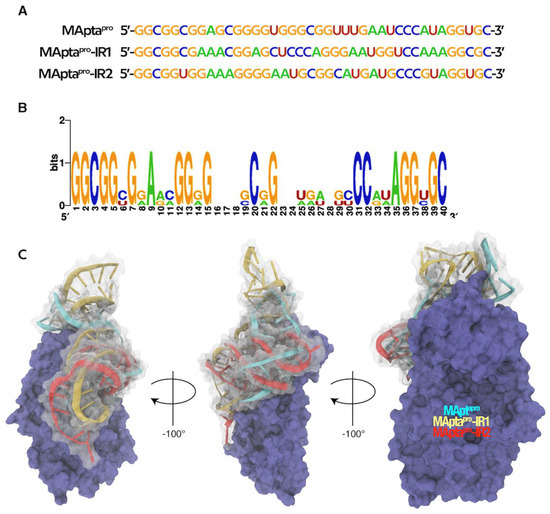 (A) Sequences of the best selected ssRNA aptamers. (B) Weblogo of the three sequences of the best selected aptamers. (C) VMD generated image showing the overlap of MAptapro (cyan), MAptapro-RI1 (yellow) and MAptapro-RI2 (red) aptamers in complex with Mpro (purple).