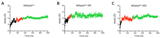 The RMSD plot of the three aptamers, and principal component analysis (PCA), revealed some differences among the aptamer structures during the 100 ns simulation time (Figure 7A and Figure S4). MAptapro had the highest RMSD of 4.37Å with an average of 3.37 ± 0.64Å and showed some fluctuations. The aptamer–protein interaction attempts to reach an equilibrium state with an oscillation of 3Å after 12 ns. This new state was lost after 5 ns of simulation, as the RMSD increased steadily until 30 ns when reaching a new equilibrium state (Figure 7A). The equilibrium state was observed after 20 ns with a fluctuation of 4Å and 3Å for both MAptapro-IR1 and MAptapro-IR2 complexes, respectively. The highest RMSD values for MAptapro-RI1 was 5.40Å with an average of 4.25 ± 0.66Å, while the MAptapro-RI2 RMSD was 4.04Å with an average of 3.14 ± 0.43Å. In both cases the equilibrium state continued over the simulation time (Figure 7B,C).