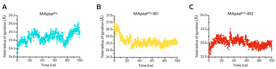 Time evolution of the radius of gyration (Rg) for (A) MAptapro, (B) MAptapro-IR1, and (C) MAptapro-IR2 in complex with Mpro protein during 100 ns molecular dynamics simulation.