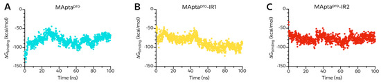 MM/PBSA binding energies vs. time for MAptapro (A), MAptapro-IR1 (B), and MAptapro-IR2 (C) towards SARS-CoV-2 main protease (Mpro).