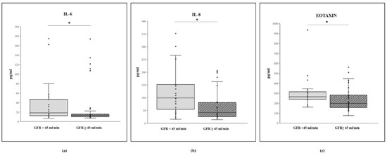 | Variable (pg/mL) | GFR < 45 mL/min/1.73 m2 (n = 28; 37.8%) | GFR ≥ 45 mL/min/1.73 m2 (n = 46; 62.2%) | p-Value (Mann–Whitney U Test) |