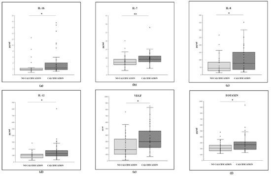| Variable (pg/mL) | No Calcification (n = 34; 45.9%) | Calcification (n = 40; 54.1%) | p-Value (Mann–Whitney U Test) |