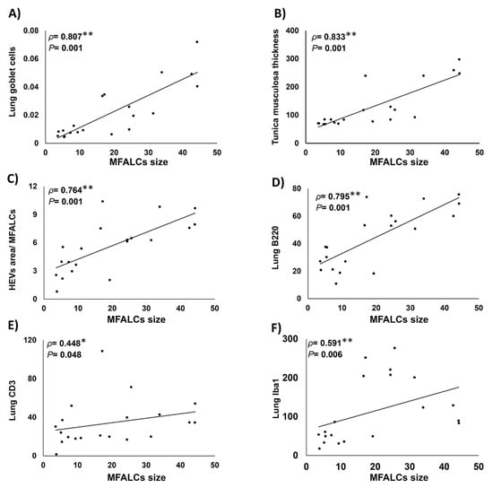 2.6. Histopathological Correlations between MFALCs’ Size, Indices of Lung Asthma Induction, High Endothelial Venules within MFALCs, and Immune Cells’ Infiltration in Lung