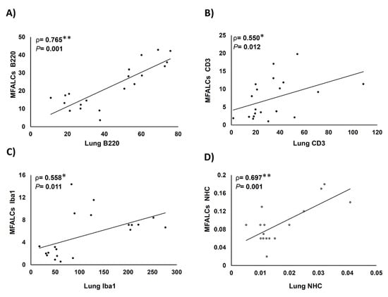2.7. Histopathological Correlations between Immune Cell Populations in MFALCs and Infiltration in the Lung