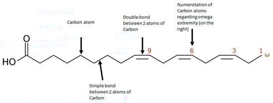 Omega-3 fatty acids (omega-3) play a central role in brain functioning and may be a promising therapeutical alternative for vulnerable individuals. Omega-3 is an unsaturated fatty acid composed of a carboxylic acid with a long hydrophobic aliphatic chain, which has a first double bond on its third carbon (counting from the ‘CH3-end’ of the chain–Figure 1) [,]. Omega-3 belongs to monounsaturated (one bond) or polyunsaturated (up to six bonds) fatty acids (PUFA). α-linolenic acid (ALA) is an omega-3 PUFA that originates mainly from the diet and leads to the synthesis of other omega-3 PUFAs-through a series of metabolic cascades-including eicosapentaenoic acid (EPA) and the docosahexaenoic acid (DHA). However, their yields are relatively low, and supplements of EPA and DHA have been made available, mostly from fish oil extracts, to overcome potential deficits or an imbalance in omega-6, of which overconsumption has been associated with increased risk of inflammation and cardiovascular diseases []. In psychiatric disorders, a decrease in omega-3 levels has been uncovered in the neuron membrane of individuals with mood disorders and schizophrenia []. Research on lipid composition in cell membranes and in the serum of patients with schizophrenia has shown that higher levels of omega-3 are correlated with lower negative symptom severity, and with higher scores in cognition [], although mixed results are found in the literature []. In UHR patients, lower levels of omega-3 and omega-3/omega-6 ratios (healthy ratio varies between 1-to-1 and 1-to-4) in erythrocyte membranes have been correlated with increased severity of depressive, psychotic, and general psychopathology symptoms and with increased cognitive impairment [,]. Thus, omega-3 supplementation has been proposed as a potential preventive treatment for UHR individuals as it might prevent transition to psychosis [], and the supplementation appears to be safe and well tolerated [].