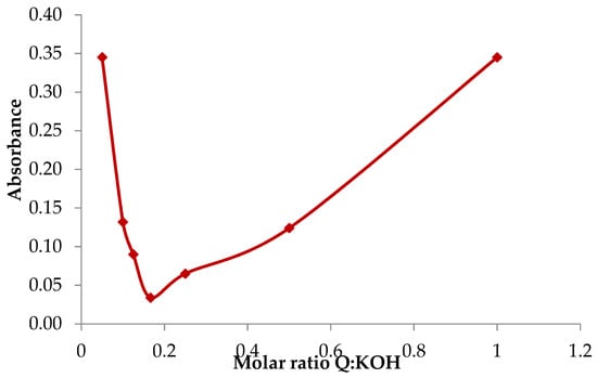 Job’s method [] was used to determine the optimal ratios between the reagents, i.e., quercetin and potassium ions. To this end, a methanolic solution of quercetin (Sigma-Aldrich, Steinheim, Germany) at a concentration of 1 mM was added to a 1 mM KOH solution in volume ratios of 1:20-10:1, after which the absorbance was measured at the wavelength λ = 374 nm. Graphs of the relationship between the molar fraction of the reagents and the absorbance of the solutions were plotted, and then, using the first derivative method, the molar fraction of the reagents in which the absorbance value was minimal was determined.