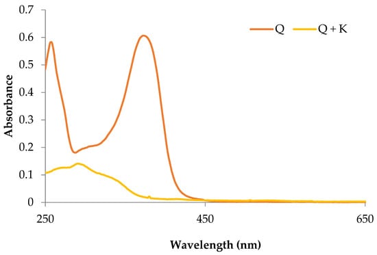 UV-vis spectrum of potassium quercetin derivative and quercetin. Q—quercetin methanol solution with a concentration of 0.1 mg/mL. Q + K—methanolic solution of potassium quercetin derivative with a concentration of 0.1 mg/mL.