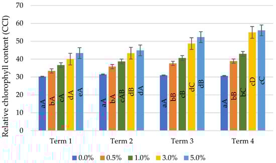 Effect of quercetin derivative concentrations and terms of measurement on relative chlorophyll content (Term 1—first day after the first treatment, Term 2—seventh days after the first treatment, Term 3—first day after the second treatment, Term 4—seventh days after the second treatment). Capital letters indicate significant differences between the means at measurement terms for each quercetin derivative concentrations, lowercase letters indicate significant differences between the means at respective measurement terms according to ANOVA (followed by Tukey’s HSD test, p = 0.05).