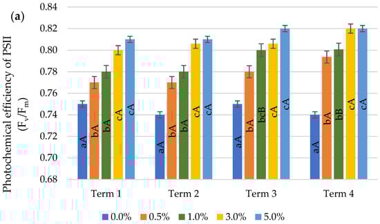 The value of chlorophyll fluorescence parameters increased by the subsequent measurement dates. Only in the case of Fv/Fm, no significant differences were observed, except for the application of the concentration of 1.0%, which caused an increase of 2.6% after the second application (Term 3 and 4). Significant increases in Fv/F0 and PI values were already observed on the seventh day after the first application (Term 2), with the exception of the application of a concentration of 1%, which caused an increase in Fv/F0 only after the application of the second spraying.