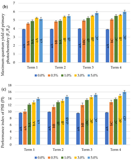 Effect of quercetin derivative concentrations and terms of measurement on chlorophyll fluorescence parameters: (a) photochemical efficiency of PS II (Fv/Fm); (b) maximum quantum yield of primary photochemistry (Fv/F0) and (c) performance index of PS II (PI). (Term 1—first day after the first treatment, Term 2—seventh days after the first treatment, Term 3—first day after the second treatment, Term 4—seventh days after the second treatment). Capital letters indicate significant differences between the means at measurement terms for each quercetin derivative concentrations, lowercase letters indicate significant differences between the means at respective measurement terms according to ANOVA (followed by Tukey’s HSD test, p = 0.05).