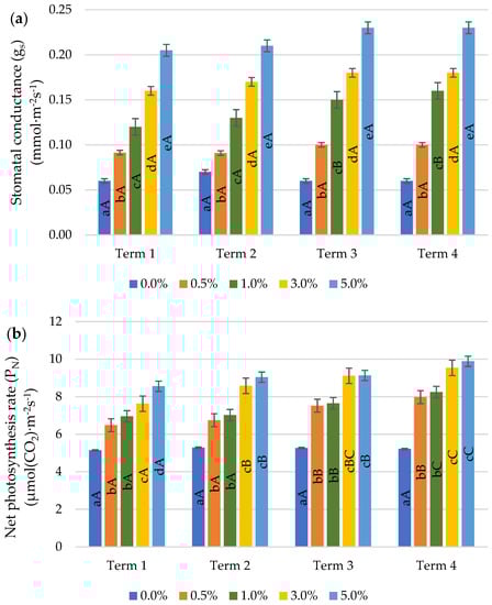 Effect of quercetin derivative concentrations and terms of measurement on gas exchange parameters: (a) stomatal conductance (gs); (b) net photosynthesis rate (PN); (c) transpiration rate (E) and (d) intercellular CO2 concentration (Ci). (Term 1—first day after the first treatment, Term 2—seventh days after the first treatment, Term 3—first day after the second treatment, Term 4—seventh days after the second treatment). Capital letters indicate significant differences between the means at measurement terms for each quercetin derivative concentrations, lowercase letters indicate significant differences between the means at respective measurement terms according to ANOVA (followed by Tukey’s HSD test, p = 0.05).