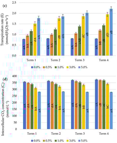 An effect of the application of quercetin derivative solutions on an increase in the values of parameters (gs, PN and E) (Figure 5a–c) and a decrease in Ci (Figure 5d) compared to the control was found. On all measurement dates, a significant increase was found in the values of E and gs parameters proportional to the quercetin derivative concentrations applied. Only on the seventh day after the first application (Term 2), there were no significant differences in the value of E as a result of spraying with 3.0 and 5.0% solutions. Quercetin derivative concentrations 0.5 and 1.0% as well as 3.0 and 5.0% did not significantly influence the differentiation of the PN value in Term 2, 3 and 4. In Term 1, the PN value did not differ between the concentrations of 0.5 and 1.0%, while as a result of spraying with 3.0% and 5.0% concentrations a significant increase in PN was observed. A significant decrease in the value of Ci was observed with the application of higher concentrations of quercetin derivative (Terms 1, 2 and 3). In term 4, the highest value of Ci (at the control level) was demonstrated by using concentrations of 0.5 and 1.0%.