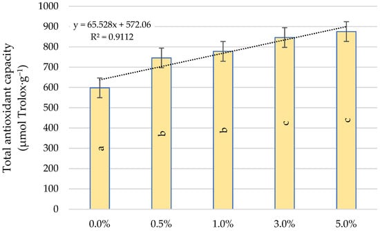 Effect of quercetin derivative concentrations on total antioxidant capacity. Different letters indicate significant differences between each quercetin derivative concentrations, according to ANOVA (followed by Tukey’s HSD test, p = 0.05).