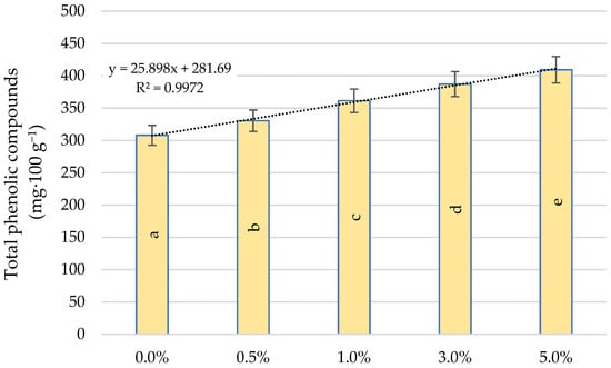 Effect of quercetin derivative concentrations on total phenolic compounds. Different letters indicate significant differences between each quercetin derivative concentrations, according to ANOVA (followed by Tukey’s HSD test, p = 0.05).