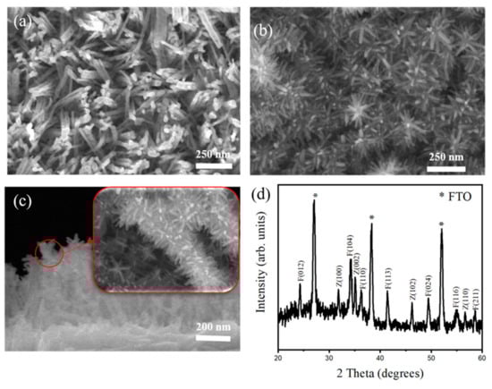 SEM top view image: (a) pristine Fe2O3 nanorod template and (b) Fe2O3–ZnO. (c) Cross-section SEM image of Figure (b) and the subfigure is an enlarged image. (d) XRD pattern of Fe2O3–ZnO heterostructures. The asterisk, Z, and F denote FTO, ZnO, and Fe2O3, respectively.