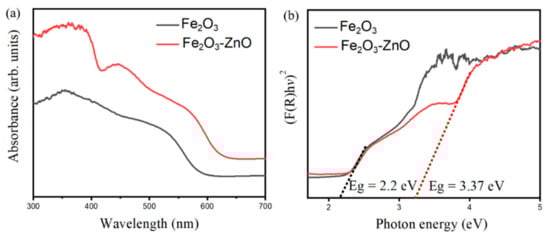 UV–vis absorption spectra of (a) pristine Fe2O3 nanorod template and Fe2O3–ZnO. (b) Evaluation of bandgap energies of Fe2O3 and Fe2O3–ZnO.