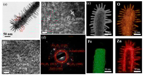 Figure 3a presents the TEM image of a Fe2O3–ZnO heterostructure. A good brush structure was visibly displayed, and the branched rods had an average diameter and length of 12 nm and 25 nm, respectively. Figure 3b,c display the HRTEM images of the heterostructure taken from various local regions. The ordered lattice fringes with interval distances of 0.28 nm and 0.26 nm were corresponded to the interplanar spacings of α-Fe2O3 (110) and ZnO (002), respectively. Figure 3d demonstrates the selected area electron diffraction (SAED) pattern taken from several Fe2O3–ZnO composites, revealing that the concentric rings could be attributed to α-Fe2O3 (104), (110), and (113) and the ZnO (100), (002). The SAED analysis responds to the XRD result, confirming that crystalline Fe2O3–ZnO heterostructures were successfully formed. Figure 3e shows the energy dispersive spectroscopy (EDS) elemental mapping analysis of an individual Fe2O3–ZnO heterostructure. The Fe signals could be only detected in the core region, while Zn signals were predominant in the outer region, and the distribution of Zn element further confirmed that the surface of the Fe2O3 was decorated by ZnO nanorods. The O signals can be recognized from the whole heterostructure. The EDS mapping analyses confirmed that the as-synthesized product formed a compositionally homogeneous composite.