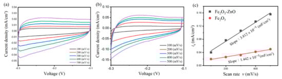 Surface area is an important factor that affects the gas sensing characteristic, which should be investigated for the heterostructure sample. The electrochemical catalyst surface activity (ECSA) of the as-fabricated α-Fe2O3 and Fe2O3–ZnO heterostructure sample are estimated with the cyclic voltammetry (CV) from the double-layer capacitance (Cdl). As shown in Figure 4a,b, the CV curves of α-Fe2O3 and Fe2O3–ZnO, respectively, at non-Faradaic potential regions (−0.3–0.1 V vs. NHE) separated with different scan rates, from 0.1 mV/s to 0.5 mV/s. The ECSA can be calculated from the Cdl divided by the specific capacitance (Cs), namely ECSA = Cdl/Cs, and is proportional to the Cdl value. The correlation between the double-layer capacitance (Cdl) and the double-layer charging current (ic) follows the equation: Cdl = ic /ν. The ic = (ja − jc), in which ja is anodic current and jc is cathodic current at the middle potential (−0.2 V) against the CV scan rate. Figure 4c shows that the plot of ic vs. ν has a linear characteristic and the slope corresponds to the Cdl. Notably, for a comparison, the ic vs. ν plot of the pristine Fe2O3 was also included in Figure 4c. Obviously, the Fe2O3–ZnO has a larger ECSA size, which is approximately 3.8 times higher than that of the pristine Fe2O3. The larger ESCA provided more active sites for the interface reaction between photoelectrode and electrolyte, and this is attributable to higher diffusion space between the numerous tiny branched ZnO nanorods of the heterostructure, as confirmed by the aforementioned structural analysis [,]. The ECSA analysis reveals that the brush heterostructure produced more surface area for reaction species adsorb or desorb on it, which might further benefit its gas-sensing ability.