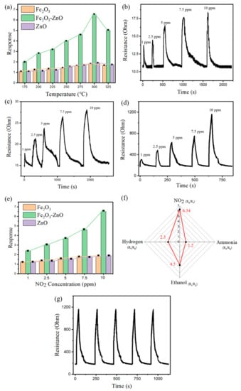 (a) Operating temperature-dependent 10 ppm NO2 gas-sensing response for Fe2O3, ZnO, and Fe2O3-ZnO sensors. (b–d) Dynamic gas-sensing curves of Fe2O3, ZnO, and Fe2O3-ZnO sensors towards different NO2 gas concentrations at 300 °C, respectively. (e) Gas-sensing response vs. NO2 gas concentration for various sensors at 300 °C. (f) Cross-selectivity of Fe2O3-ZnO sensor. The responses are marked with red. (g) Cycling gas-sensing curves for the Fe2O3-ZnO sensor towards 10 ppm NO2 gas.