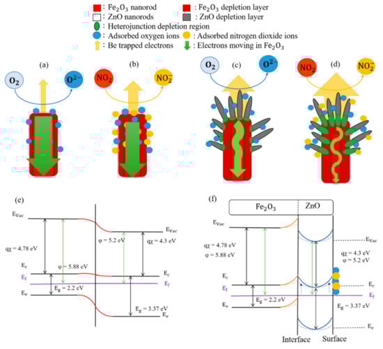 Figure 6a indicates that the electron transport channel size inside the pristine Fe2O3 nanorod can be modulated by the surface electron depletion layer, which surrounds the nanorod’s surface. Initially formed through the adsorption of oxygen molecules on the surface, the electrons are extracted from the conduction band of the nanorods to form adsorbed oxygen ions (Oads2−) [,]. As presented in Figure 6b, further exposure of the Fe2O3 nanorod template to NO2 gas resulted in the marked extraction of its surface electrons through the surface reaction with the NO2 molecules, forming surface-adsorbed NO2− ions. The conducting channel of the Fe2O3 nanorod was further narrowed, thereby increasing the bulk resistance of the Fe2O3 sensor. For the NO2 gas-sensing mechanism of the brush-like Fe2O3–ZnO heterostructure in Figure 6c,d, the influence of the sample morphology for highly accessible NO2 gas molecule adsorption should be considered. The appreciable morphological difference between the composite and pristine Fe2O3 may result in several concomitant effects in the composite, such as high reactive surface area size, high airflow channel effect, and the high surface trapping and low reaction time with the target gas molecules. The aforementioned ECSA result demonstrated the substantially enhanced surface reaction of the Fe2O3–ZnO compared with that of the pristine Fe2O3. The brush-like configuration is also beneficial in the formation of pathways between the branches. The target gas molecules can effectively react with the sample surface, increasing the number of captured electrons from the Fe2O3 and ZnO conduction bands and effectively reducing the response and recovery time during gas-sensing tests [,]. The diameter of decorated ZnO branches plays a vital role in the gas-sensing performance of the heterostructure. The average diameter of the ZnO branches was approximately 12 nm, and the Debye length of the ZnO at increased temperatures was approximately 20 nm []. The decorated ZnO nanorods should be fully depleted at the operating temperature herein. The gas-sensing response abruptly increases when the oxide semiconductor particle size becomes smaller than the Debye length []. Moreover, the Fe2O3–ZnO sensor’s gas-sensing response to NO2 gas was not only influenced by the depletion layer from the surfaces of each ZnO branch and Fe2O3 nanorod template, but also by the formation of abundant Fe2O3/ZnO heterogeneous junctions. These form because the different work functions of Fe2O3 and ZnO in the composite contribute varying degrees of bulk resistance upon exposure to NO2 gas []. The percolation network of electrons pass through potential barriers at heterogeneous junctions between the ZnO branches and Fe2O3 template. This results in high initial bulk resistance (189 Ohm) in the Fe2O3–ZnO sensor, almost 18 times that of the pristine Fe2O3 (10.5 Ohm). The initially formed Fe2O3/ZnO interfacial potential barriers effectively modulate the electron transport between the two constituents by adsorbing or desorbing target gas molecules []. These junctions can be considered additional active sites, resulting in the enhancement of the gas-sensing response when the sensor material is exposed to NO2 gas. When the Fe2O3–ZnO was further exposed to NO2 gas, as presented in Figure 6d, the Fe2O3/ZnO interfacial depletion layer size was appreciably widened, resulting in the rugged, narrow conduction channel of the Fe2O3 template. The band emery variations of the Fe2O3/ZnO at the surface and interface regions also account for the improved NO2 gas-sensing performance of the Fe2O3-ZnO composite. Figure 6e shows the band diagram of the Fe2O3/ZnO system at the equilibrium state which is constructed with the band energy parameters from previous bandgap value evaluation and literature []. Figure 6f displays the band structure variation of the Fe2O3-ZnO exposed to NO2 gas. The Fe2O3/ZnO heterogeneous interface due to the electron trapping by interface states might dominate the gas-sensing behavior of the composite toward NO2 gas. The potential barrier-controlled carrier transport mechanism might be predominant over the surface depletion mechanism for Fe2O3-ZnO; this is due to the fact that no electrons are available in the depleted decorated ZnO (size smaller than Debye length) to react with the NO2 molecules at the given test condition. Comparing the schematic configurations of NO2 gas-sensing mechanisms in Fe2O3 and Fe2O3-ZnO, the degree of bulk resistance variation associated with ZnO and Fe2O3 surface depletion and the Fe2O3/ZnO interfacial junctions in the heterostructural system were expected to be substantially higher than that of the pristine Fe2O3 template, which was merely modulated by the surface depletion layer size variation before and after exposure to NO2 gas. Based on the proposed NO2 gas-sensing model of the Fe2O3–ZnO heterostructure, the low-concentration NO2 gas-sensing performance of the pristine Fe2O3 nanorods was considerably improved through the suitable control of material synergistic effects through the formation of brush-like Fe2O3–ZnO heterostructures.