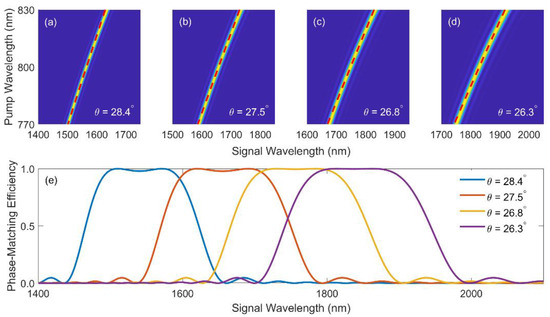 As an example, we consider the cases in 2 mm beta barium borate (BBO) crystals with different cutting angles and calculate the PM efficiency sinc2(ΔkL/2) for varying pump and signal wavelengths, as shown in Figure 1a–d. The crystals are cut for type-II phase-matching with θ = 28.4° (a), 27.5° (b), 26.8° (c), and 26.3° (d), respectively. The pump wavelength is between 770 nm and 830 nm, which is the center part of a Ti:sapphire fs laser spectrum. It is observed in each figure that the phase-matched signal wavelength varies with the pump wavelength. The most efficient part of each figure can be fit linearly, as denoted by the red dashed lines, which suggests the possibility of employing linearly chirped pulses in the chirp-compensation scheme. Note that the linear chirp indicates linear relationship between temporal delay and instantaneous frequency, whereas Figure 1a–d are plotted with respect to the wavelengths, which explains the slight curve of the “linear-fit” dashed lines.