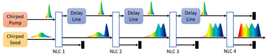 The conceptual layout of the cascaded DC-OPA is depicted in Figure 2. A narrowband pump and a broadband seed are both stretched with negative group delay dispersions (GDDs), with the chirp ratio determined by the gradient of the red dashed lines in Figure 1a–d. Due to their bandwidth difference, the pump pulse is evidently shorter than the seed pulse, hence only part of the signal spectrum can be overlapped and amplified within the pump profile.