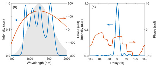 - Brida, D.; Manzoni, C.; Cirmi, G.; Marangoni, M.; Bonora, S.; Villoresi, P.; De Silvestri, S.; Cerullo, G. Few-optical-cycle pulses tunable from the visible to the mid-infrared by optical parametric amplifiers. J. Opt. 2009, 12, 013001. [Google Scholar] [CrossRef]
