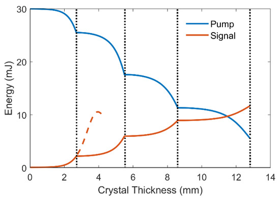 Pump (blue) and signal (red) energy evolution with respect to the total crystal length, the red dashed line denotes signal energy evolution without the cascaded-crystal geometry, and the dotted lines indicate interfaces between adjacent crystals.