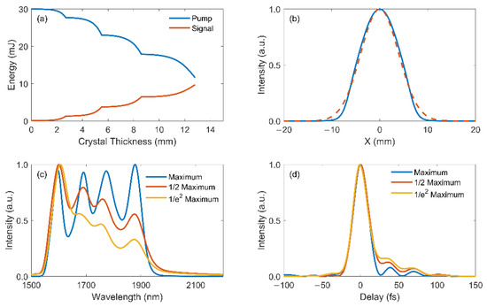 Cascaded DC-OPA using type-II BBO crystals with the angles of θ = 28.4°, 27.5°, 26.8°, and 26.3° are investigated. The system is pumped by a Gaussian-shaped 30-fs, 30-mJ, 800-nm Ti:sapphire laser pulse, and the seed is centered at 1700 nm with a transform-limited (TL) pulse duration of 15 fs and pulse energy of 100 μJ. Both the pump and seed beams are Gaussian-shaped with a diameter of 10 mm in the spatial domain. The pump and seed pulses are linearly stretched to 1.66 ps and 6.65 ps with negative GDDs of −20,000 fs2 and −36,000 fs2, respectively. The resulted pump-seed chirp ratio is 1.8, which coincides with the gradient of red dashed lines in Figure 1a–d. The temporal delays between the pump and signal pulses in four crystals are −3440 fs, −1000 fs, 1120 fs, and 2820 fs, respectively. Negative delay value indicates that the pump pulse arrives at the crystal before the seed pulse, overlapping with its high-frequency components, and vice versa. Ideal PM condition can be expected using the optimized combination of cutting angles, chirp ratio, and the pulse delays.
