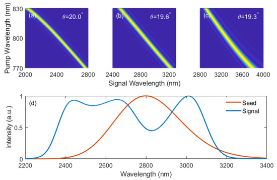 The phase-matching efficiencies of 800 nm pump and mid-IR seed in LiIO3 crystals with the cutting angles of 20.0°, 19.6°, and 19.3° are calculated and presented in Figure 7a–c, respectively. The phase-matched pump and seed wavelengths clearly show a linear trend with similar pump-signal chirp ratio, revealing the possibility of applying the cascaded DC-OPA scheme in the crystals. The process is simulated with the same pump pulse as above and a 2.8 μm, 30 fs, 100 μJ pulse as the seed. The GDDs of the input pulses are optimized to 20,000 fs2 and −20,000 fs2 for the pump and seed pulses, respectively. The pump-seed chirp ratio of −1 is used to better fit the phase-matching curve.