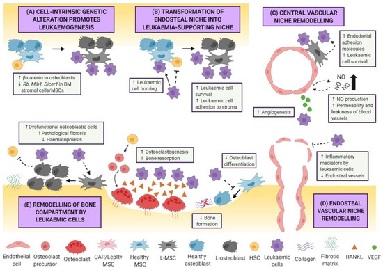 Leukaemogenesis and remodelling of the bone marrow niche by leukaemic cells. (A) Oncogenic transformation of haematopoietic cells into leukaemic cells can be initiated by cell-intrinsic genetic alterations in surrounding bone marrow niche cells. (B) During leukaemogenesis, malignant cells can hijack the mechanisms of homing used by healthy haematopoietic stem cells and directly compete with haematopoietic stem cells for endosteal adhesion, resulting in transformation of the healthy niche microenvironment into a tumour-supportive niche. Furthermore, leukaemic cells are capable of remodelling the (C) central vascular and (D) endosteal vascular niche into leukaemia-supportive microenvironments that favour leukaemia cell survival and expansion, with hostility towards physiological haematopoiesis. (E) Leukaemic cells can promote remodelling of bone compartments by directly influencing the differentiation and/or function of osteoblasts and osteoclasts, leading to severely impaired bone homeostasis.
