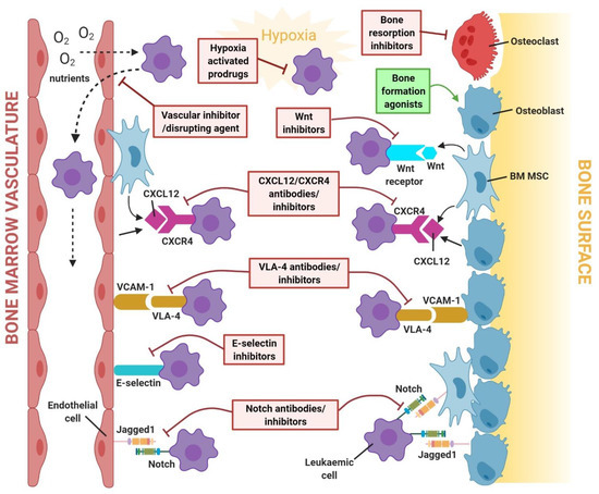Regulatory and survival pathways targeted by therapeutic agents in the leukaemia bone marrow niche. Therapeutic agents can block interactions between leukaemic cells and niche cells by interfering with cell adhesion (e.g., VLA-4/VCAM-1, E-selectin, Notch/Jagged1) and paracrine regulation (e.g., CXCL12/CXCR4, Wnt/β-catenin). Furthermore, agents that are capable of normalising bone homeostasis (by targeting osteoblast and/or osteoclast activities), as well as targeting tumour-supportive vasculature and the hypoxic environment in the leukaemia niche, show therapeutic potential.