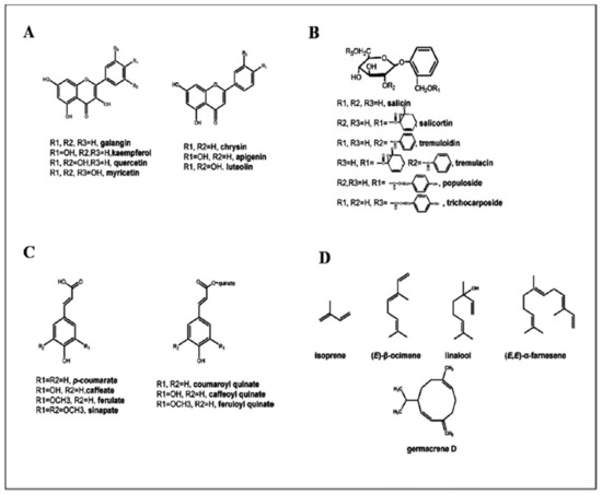 Structures of the critical types of secondary metabolites in Populus: (A) flavone and flavonol metabolites; (B) phenolic glycoside metabolites; (C) hydroxycinnamate, and (D) terpenoid metabolites.